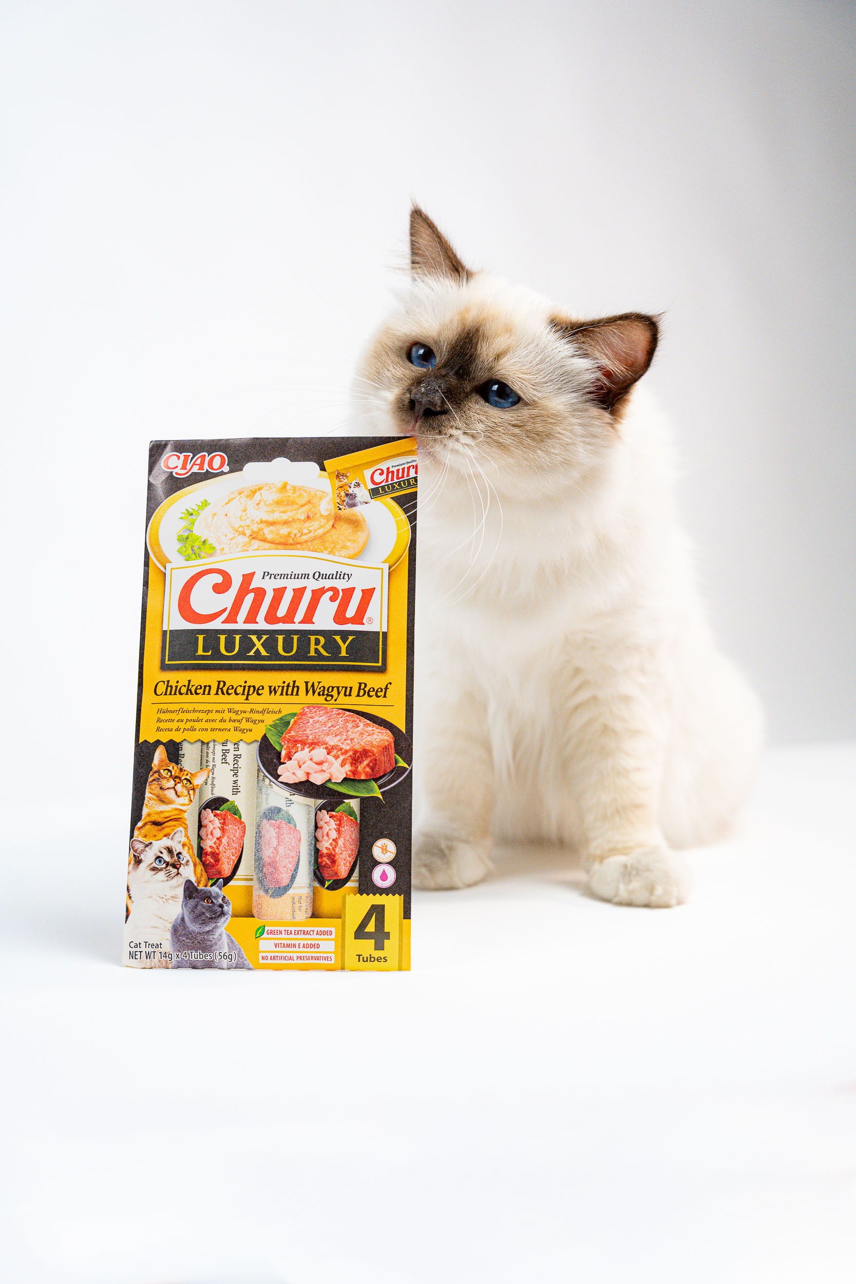 The range includes exclusive flavours such as Lobster, Sole, Prawn and Wagyu Beef, clearly positioning Churu Luxury in the high-end segment of cat food. Like the rest of the Churu range, Churu Luxury is grain-free and free from artificial additives, with a high moisture content to support hydration.
