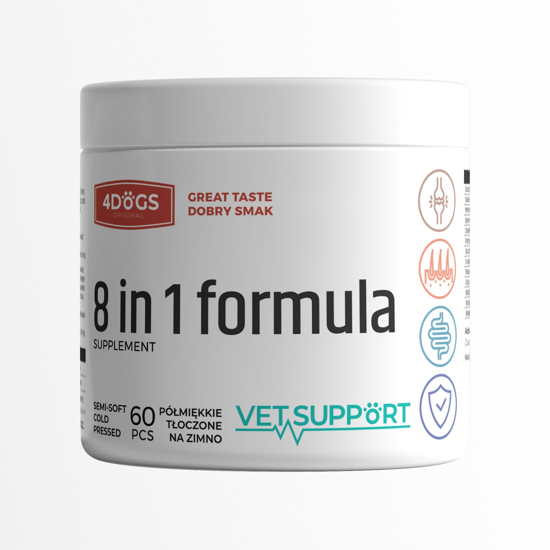VetSupport is een innovatieve lijn voedingssupplementen voor honden in de vorm van zachte, smakelijke treats, ontwikkeld om de gezondheid en het welzijn van honden op meerdere niveaus te ondersteunen. De producten combineren zorgvuldig geselecteerde actieve ingrediënten zoals vitaminen, mineralen, probiotica, plantenextracten en functionele voedingsstoffen, telkens afgestemd op een specifieke behoefte. De afzonderlijke formules ondersteunen onder andere de weerstand, gewrichten en botten, spijsvertering, urinewegen, huid en vacht, stressvermindering en darmbalans. Elk supplement heeft een duidelijk omschreven functie en bevat actieve ingrediënten met bewezen werking, waardoor dagelijkse suppletie eenvoudig en aangenaam wordt. De VetSupport-lijn is geschikt voor honden van alle rassen, groottes en leeftijden en past moeiteloos in de dagelijkse verzorging.