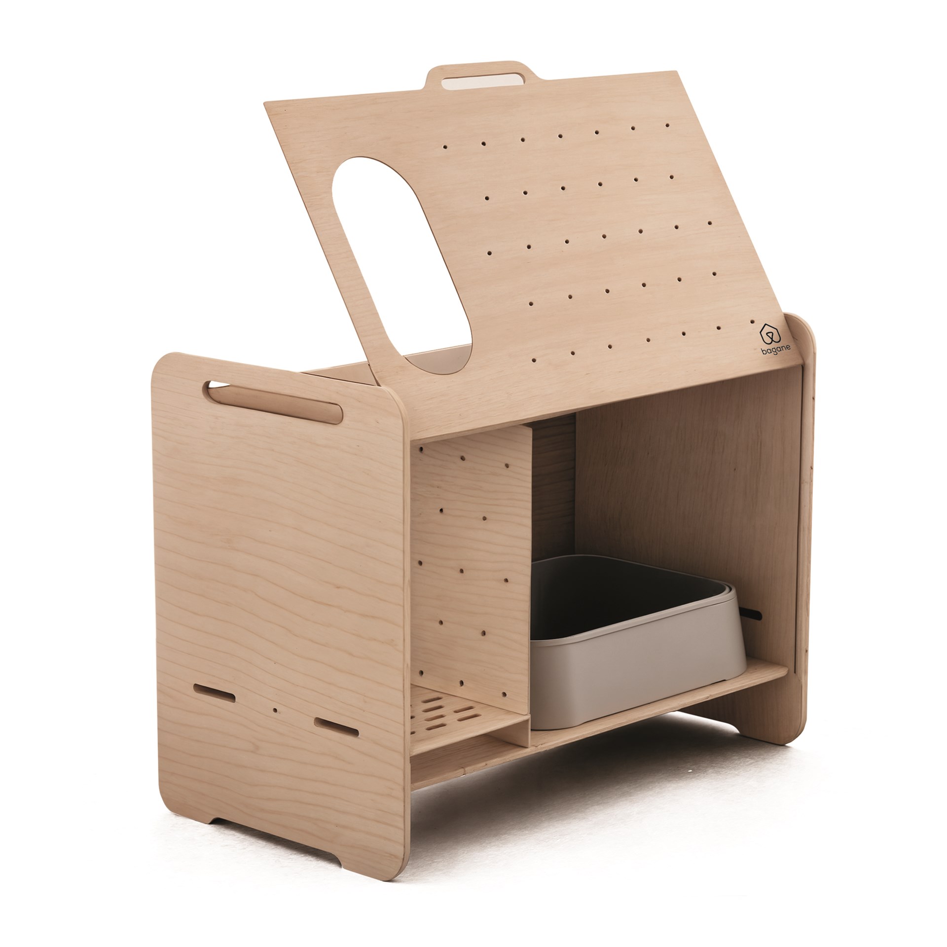 Conçu pour simplifier l’entretien, Rochefort est doté d’un panneau latéral à glissière : il s’ouvre vers le haut pour accéder en un geste au bac à litière. Plus besoin de déplacer le meuble — le nettoyage devient fluide, rapide et hygiénique. Le chat entre quant à lui confortablement par une ouverture latérale, et la structure ventilée limite les odeurs tout en garantissant une atmosphère saine.