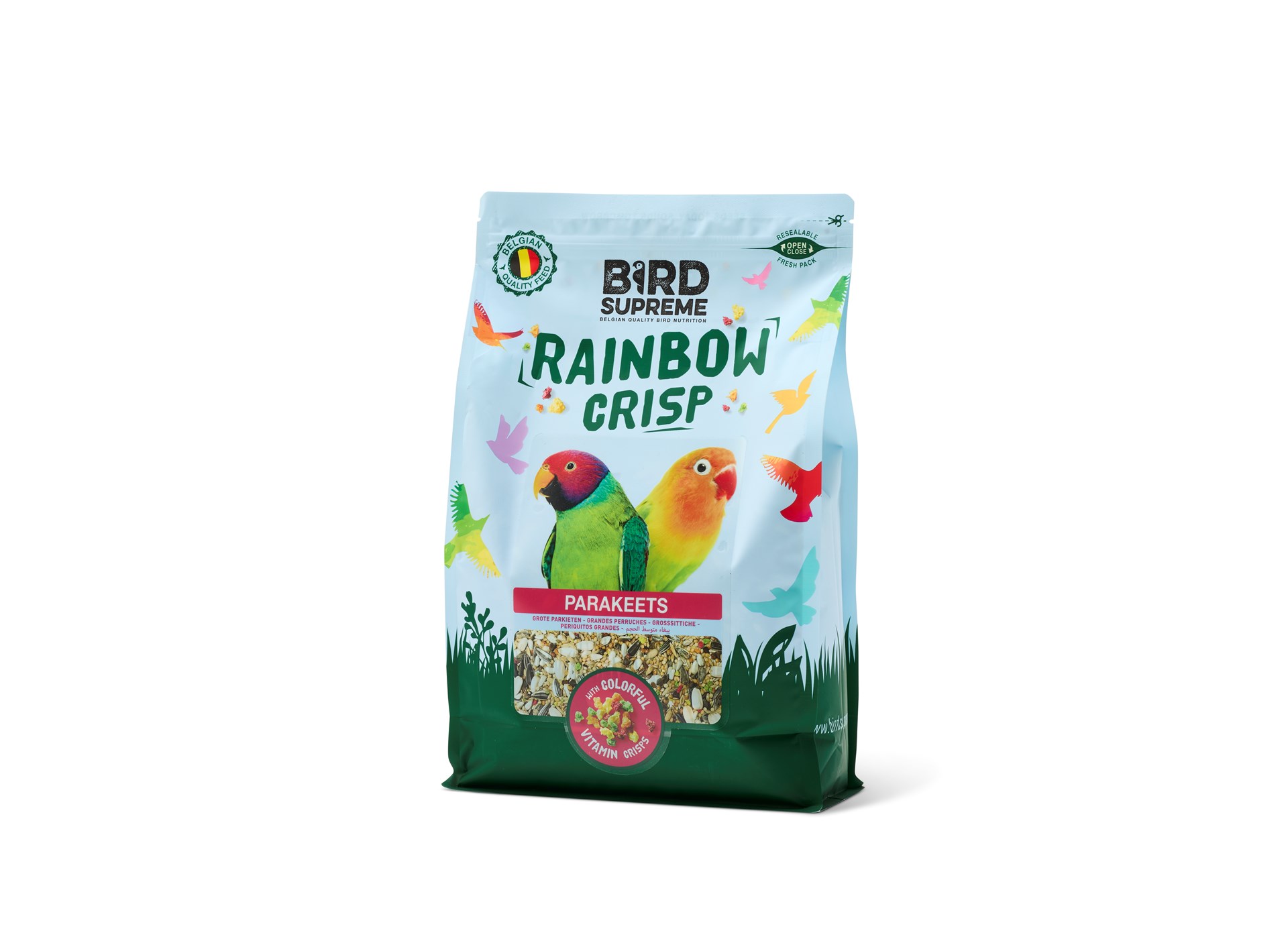 Bird Supreme Rainbow Crisp introduceert een functionele innovatie binnen het segment van siervogelvoeding door klassieke zaadmengelingen te combineren met kleurrijke, krokante vitamine-crisps. Deze crisps zijn verrijkt met vitamines A, D en E en zorgen voor een meerwaarde op vlak van vitaliteit, weerstand en verenkleed. De samenstelling is ontwikkeld door de firma Vanrobaeys op basis van Belgische nutritionele expertise en ondergaat strenge kwaliteitscontroles om consistentie en stofvrijheid te garanderen. Bird Supreme Rainbow Crisp speelt in op hedendaagse consumentenverwachtingen rond gezondheid, gebruiksgemak en productdifferentiatie, mede dankzij de in het oog springende hersluitbare verpakking die versheid optimaliseert. Het gamma is toepasbaar voor meerdere siervogelsoorten en combineert nutritionele functionaliteit met een visueel onderscheidend productconcept binnen het bestaande marktlandschap.