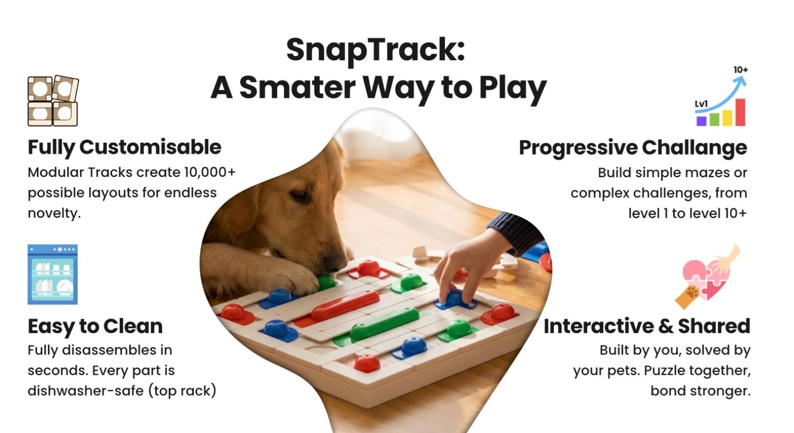 Bij gewone puzzels weet een hond na een paar keer hoe het werkt en verdwijnt de uitdaging. Bij SnapTrack verandert het spel telkens opnieuw. Door het parcours aan te passen krijgt de hond steeds een nieuwe uitdaging en raakt hij niet snel verveeld.