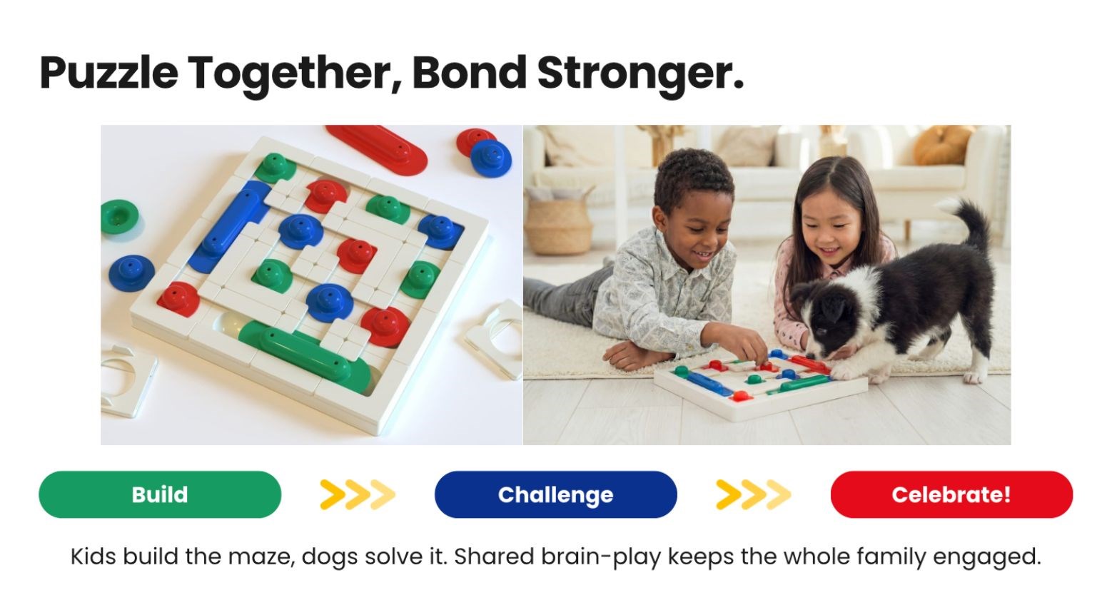 Het parcours wordt samen opgebouwd en door de hond opgelost. Dit gedeelde speelconcept zorgt voor actieve betrokkenheid, mentale stimulatie en echte interactie tussen mens en dier.