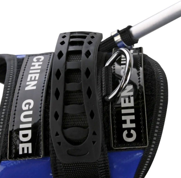 Harnas voor blindengeleidehonden, ontworpen in samenwerking met de École de Chiens Guides de l’Est (Frankrijk) om te voldoen aan de functionele en ergonomische vereisten van het geleidewerk.