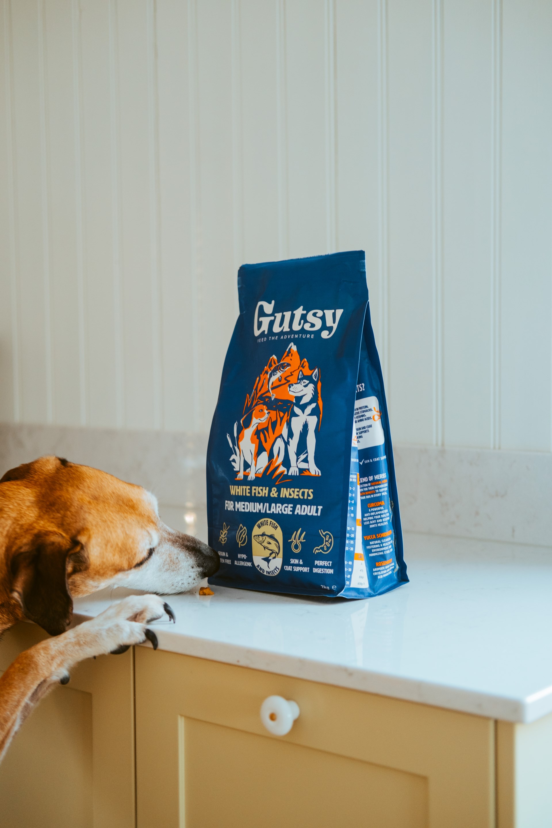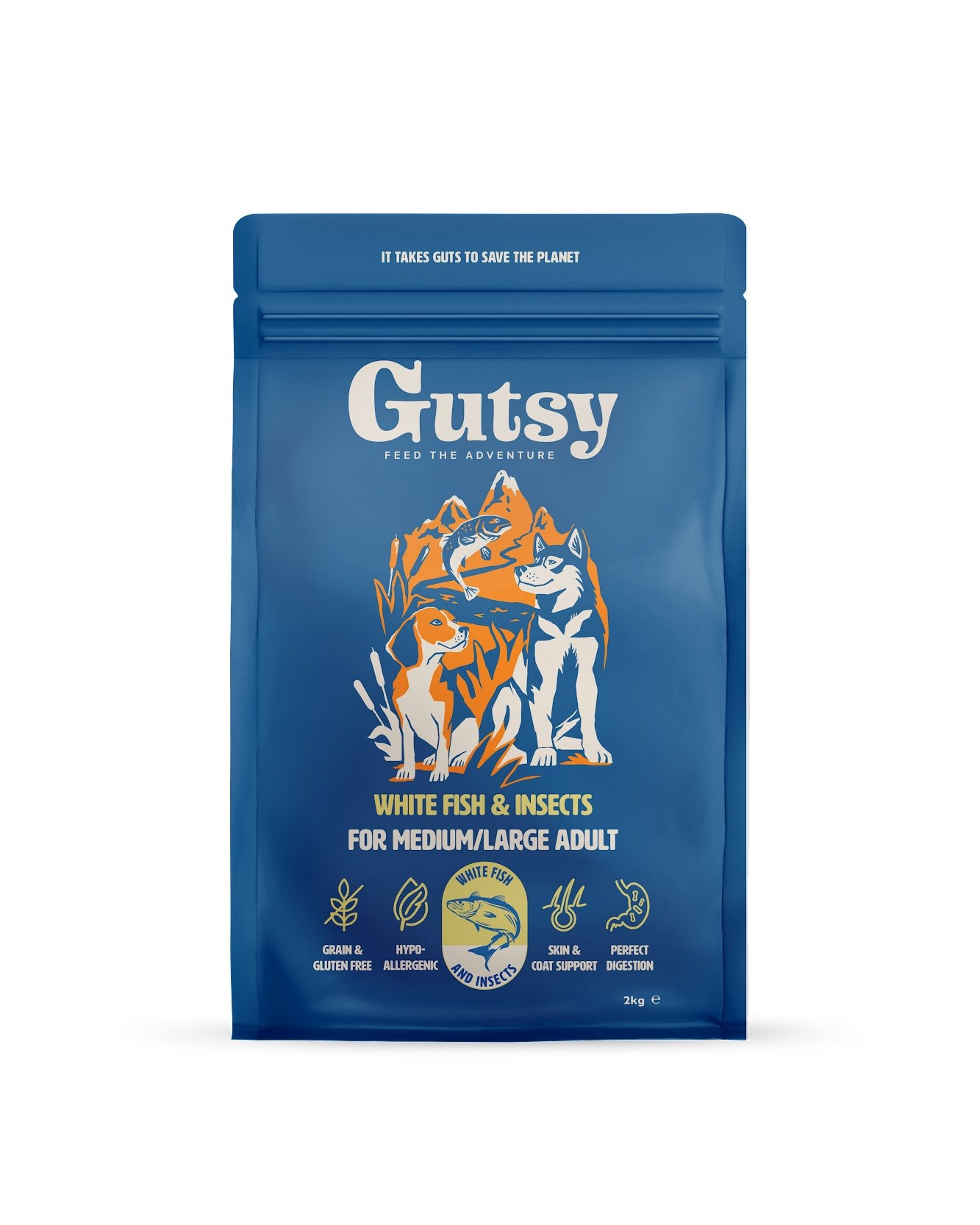 Hondenvoeding op basis van witte vis, insect, zoete aardappel, groenten en fruit. Verkrijgbaar voor puppies, kleine volwassen honden en grote volwassen honden in zakken van 2-6-10kg.