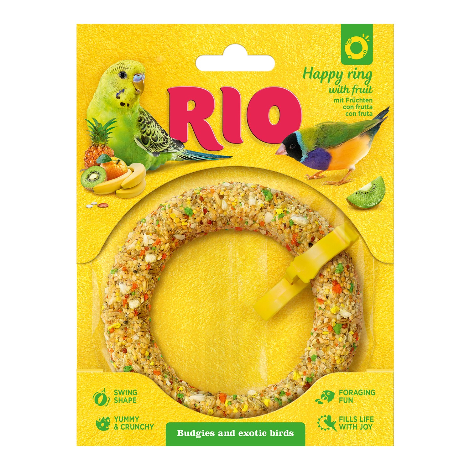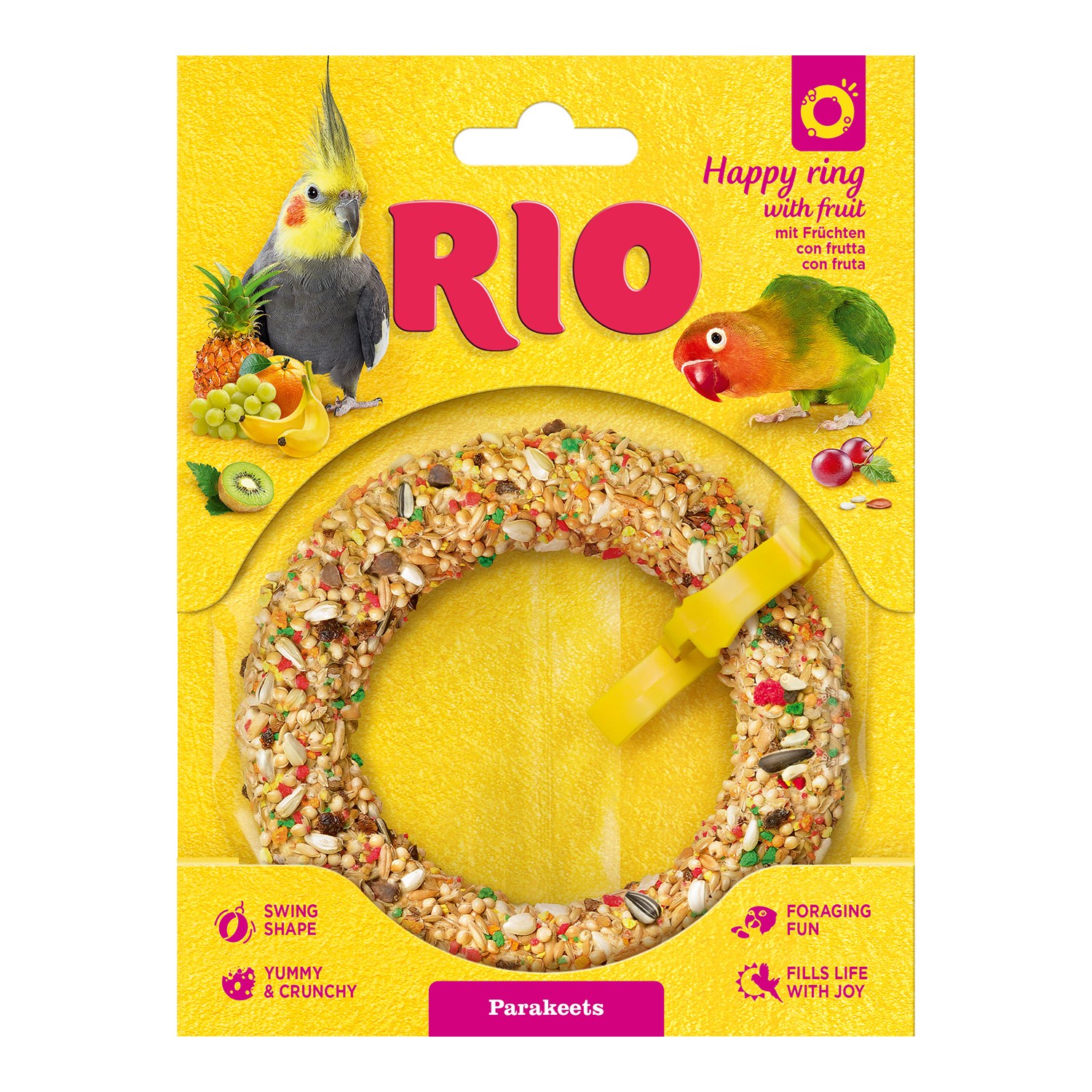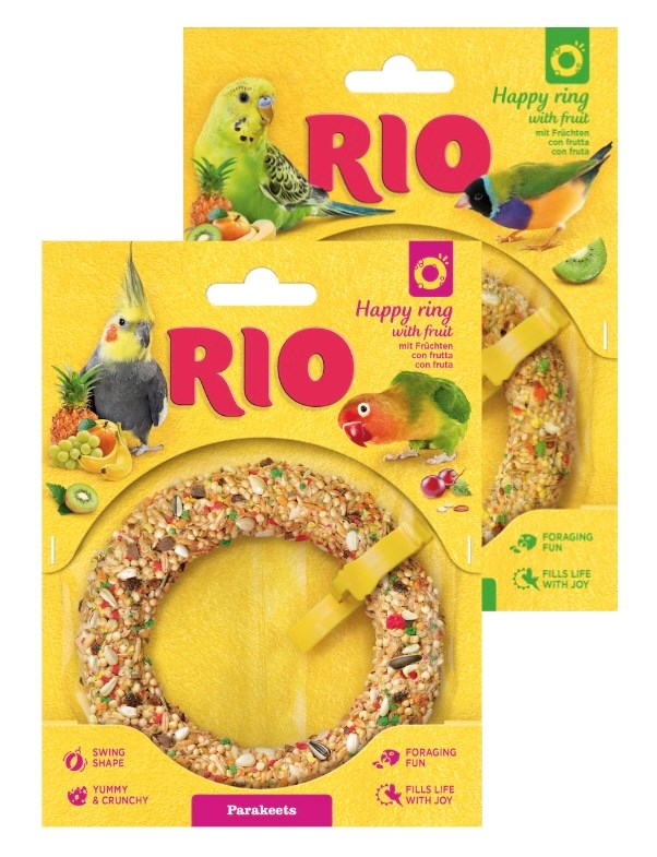 RIO Happy Rings zijn vrolijke snack-speeltjes die zijn ontwikkeld om het natuurlijke gedrag en de foerageerinstincten van actieve huisvogels te stimuleren. Deze heerlijke, knapperige traktaties dienen zowel als smakelijke aanvulling op het dieet als als leuk speelgoed, helpen de voeding te verrijken en bevatten een verscheidenheid aan waardevolle zaden en tropisch fruit zoals banaan, sinaasappel, ananas en kiwi.
