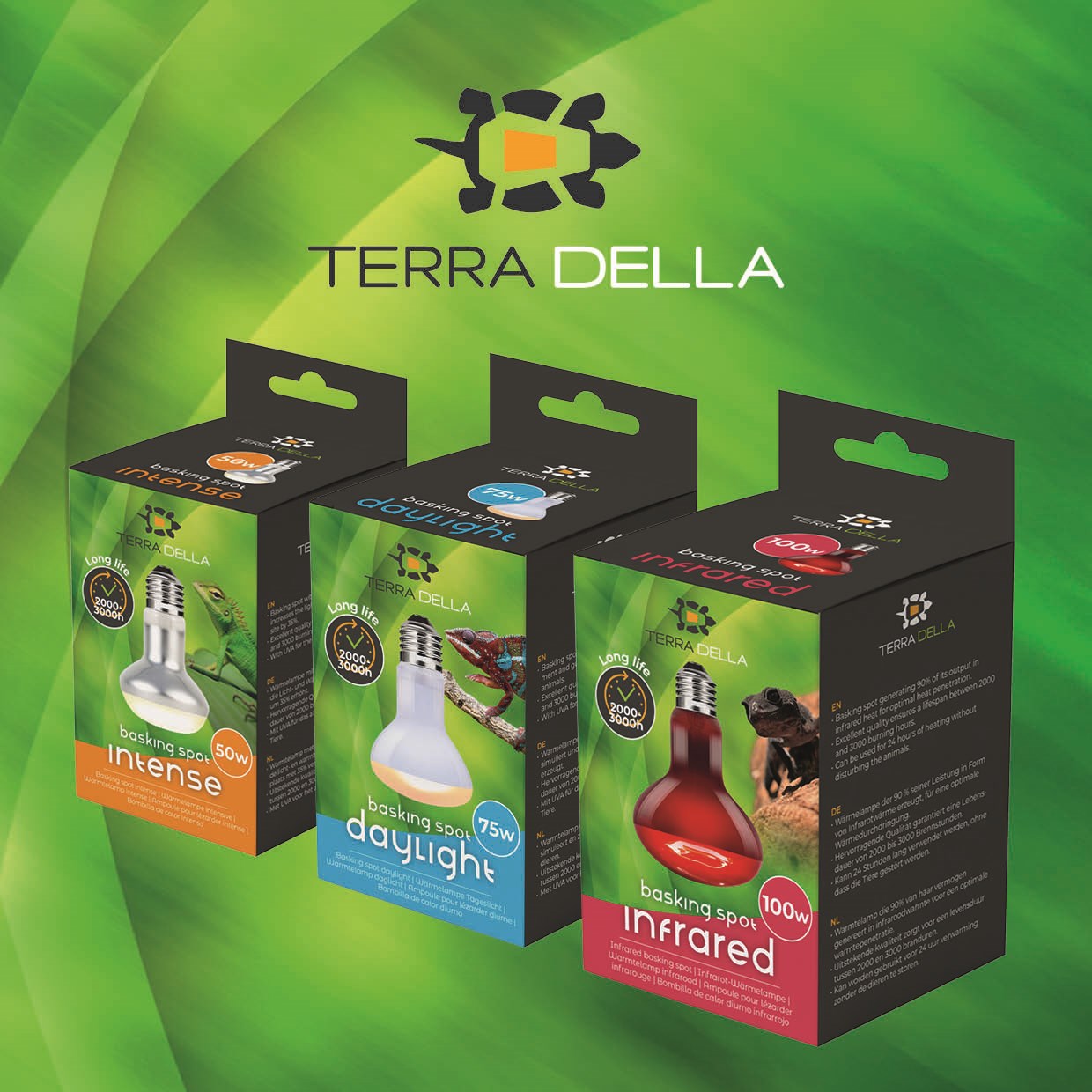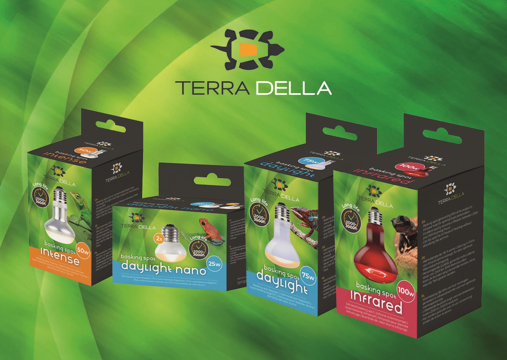 Een goed terrarium draait om één ding: een stabiel microklimaat. Met de nieuwe Terra Della warmtelampen geeft reptielen en andere terrariumbewoners precies wat ze nodig hebben. Deze vier modellen tillen comfort en welzijn in elk terrarium naar een hoger niveau. Of u nu kiest voor een extra intense zonneplek, natuurlijk daglicht voor mooie kleuren, discrete warmte voor dag en nacht of een compacte nano-oplossing: binnen dit assortiment vindt u altijd de juiste match. Alle lampen zijn ontwikkeld voor terrariumgebruik, gaan 2000–3000 branduren mee, bevatten geïntegreerde UVA-straling. Bovendien zijn ze verkrijgbaar in verschillende wattages, zodat u eenvoudig de perfecte warmtebron kiest voor elk formaat terrarium en elke warmtebehoefte.