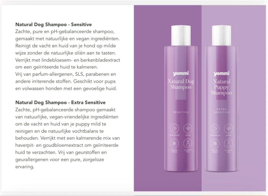 Yommi Natural Dog Shampoo is een professionele, pH-gebalanceerde hondenshampoo, ontwikkeld voor frequent gebruik in trimsalons.