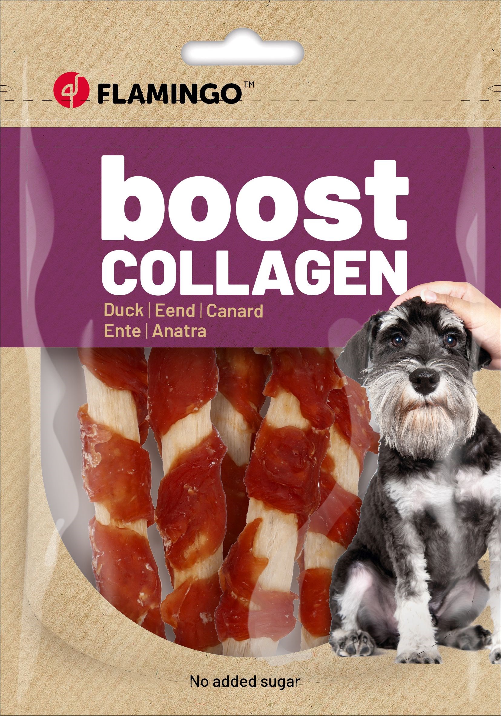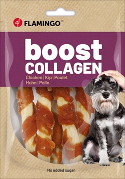 Verwen je trouwe viervoeter met deze smakelijke Boost-snackstaaf met kip of eend en collageen! Geen toegevoegde suikers, wel verwennerij voor huid, vacht en gewrichten. Perfect voor een blije, kwispelende vriend!